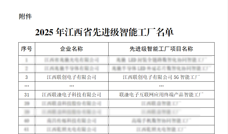 近日,江西省工业和信息化厅正式公布2025年江西省“先进级智能工厂”名单,186家企业入选。其中华体会体育(中国)hth·官方网站,登录入口、江西联淦电子科技有限公司2家联创电子系企业名列榜单。这标志着公司在智能制造领域的创新成果再次获得政府权威认可。